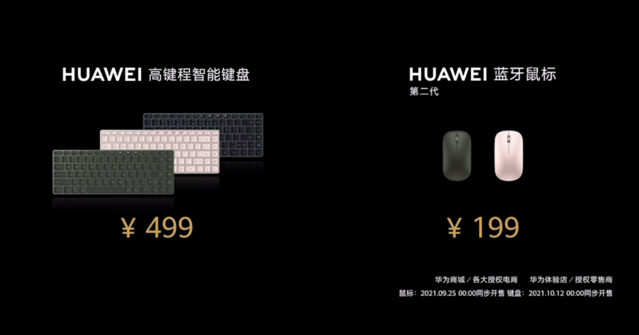 第二代華為藍(lán)牙鼠標(biāo)售價199元,2021年9月25日0點正式開售,首銷當(dāng)天優(yōu)惠20元。華為高鍵程智能鍵盤售價499元,9月13日21:08開啟預(yù)售,10月12日0點正式開售,首銷當(dāng)天優(yōu)惠50元。
