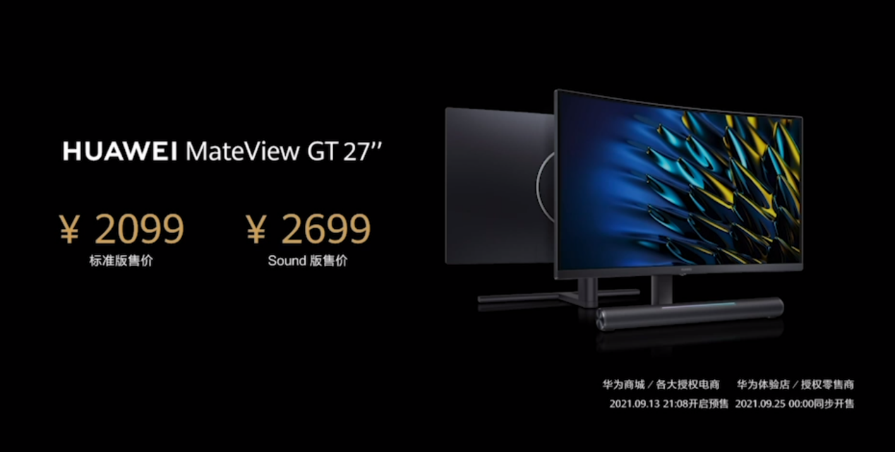 華為MateView GT 27英寸顯示器,標(biāo)準(zhǔn)版售價2099元,Sound版2699元,2021年9月13日21:08開啟預(yù)售,9月25日0點正式開售。首銷當(dāng)天購買可享受100元優(yōu)惠,曬單更有機(jī)會獲得華為拓展塢。