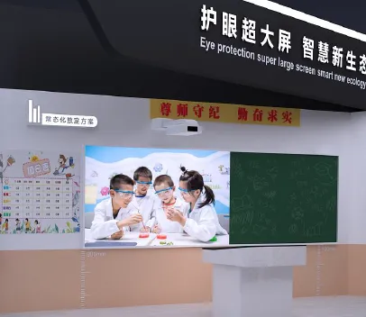 作為師生每天都會用到的普通教室,常態化教室場景方案1:1還原了老師的講臺空間。此方案由激光超短焦投影機CB-735F、120英寸天工文教互動電子白板及同尺寸記憶綠板*1 ,以及華初多核心教學控制臺*1共同打造。老師板書通過記憶綠板可同步傳輸至投影大屏幕,輕松滿足日常教學呈現清晰大畫面的需求。并通過電子白板互動功能,豐富教學體驗。