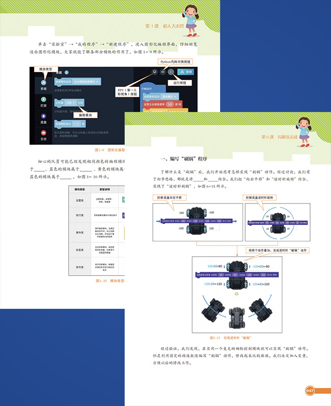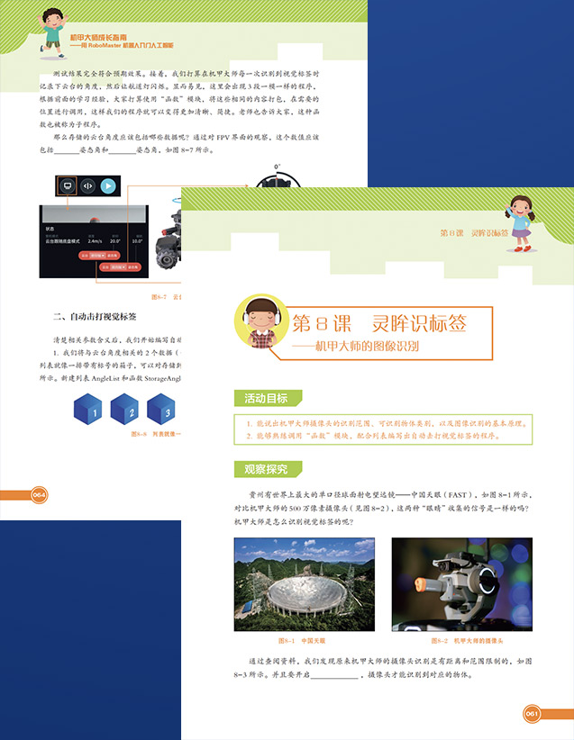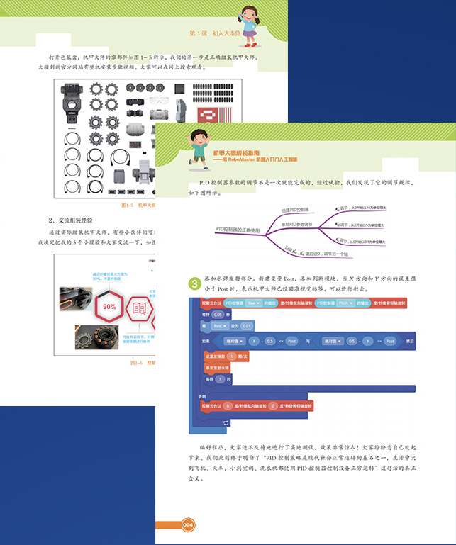 《機甲大師成長指南——用 RoboMaster 機器人入門人工智能》一書,從日常生活出發,凸顯“做中學”的教育理念,利用大疆創新教育機器人RoboMaster S1,通過一個個生動有趣的探究與實踐活動展開課程設計,突出了生活性和 趣味性,為剛剛接觸人工智能教育的學生提供了一系列可選的人工智能體驗活動。