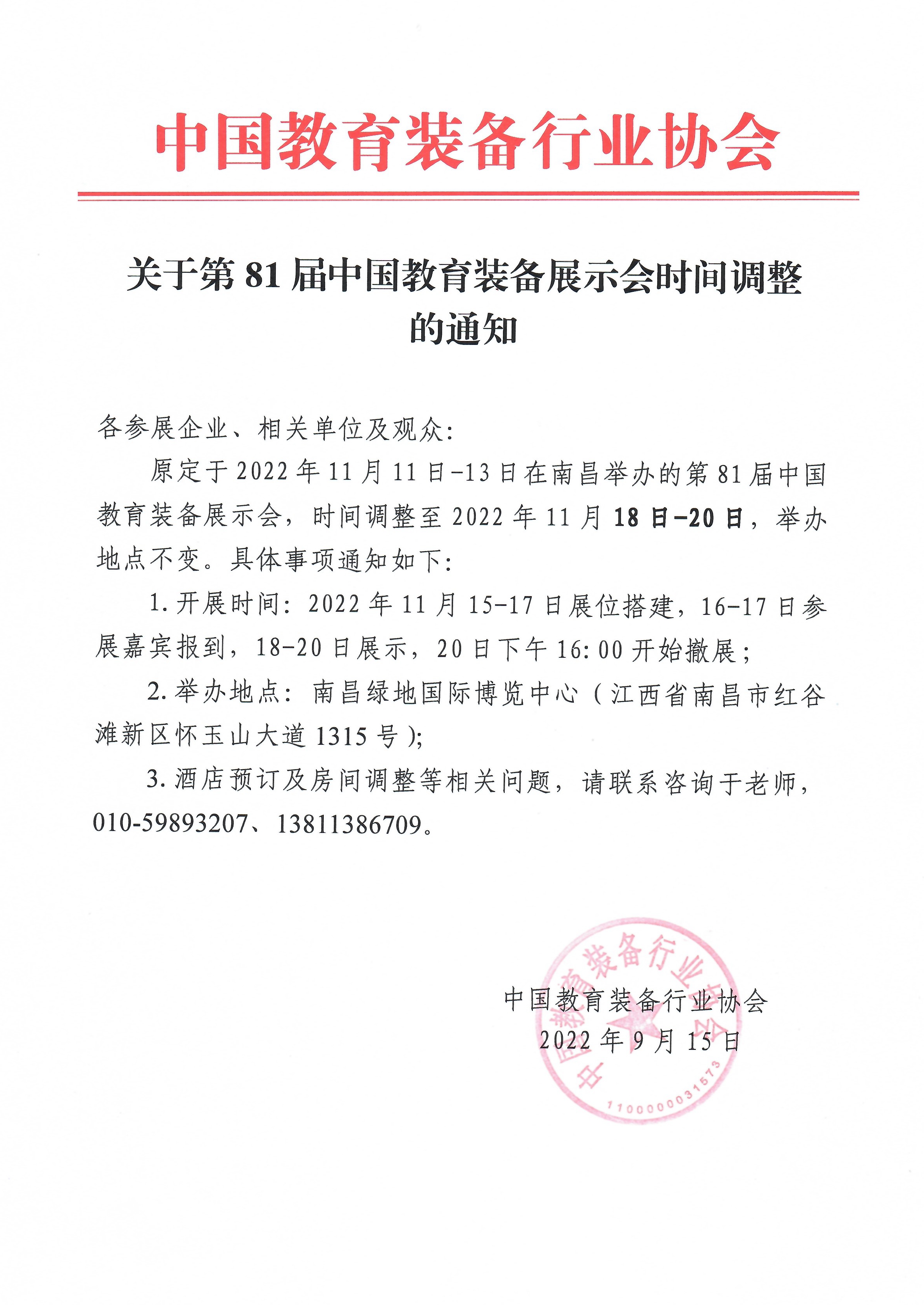原定于2022年11月11日-13日在南昌舉辦的第81屆中國教育裝備展示會,時間調整至2022年11月18日-20日,舉辦地點不變。具體事項通知如下: