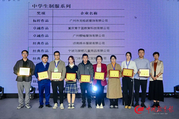 在中學制式系列中,我會會員企業廣州市龍格派服飾有限公司的作品被評為標桿作品;廣州櫻岫服飾有限公司的作品被評為卓越作品;廈門市育新工貿有限公司的作品被評為經典作品;廣州市東教服飾有限公司的作品被評為創新作品。