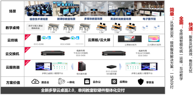 聯(lián)想多擎云桌面解決方案2.0,由云服務(wù)器、云終端、云交換機(jī)、云黑板/大屏、配套課桌椅組成,采用了國(guó)際領(lǐng)先的云桌面虛擬化技術(shù),包括VDI、VOI、IDV、TCI四種云桌面架構(gòu),作為方案的“引擎”,實(shí)現(xiàn)未來(lái)云教室統(tǒng)一融合管理。該方案可選擇公有云、私有云和混合云等多種接入方式,將計(jì)算機(jī)應(yīng)用的全場(chǎng)景云化管理,助力學(xué)校打造“一校一云一平臺(tái)”整體解決方案。同時(shí),云桌面適配國(guó)產(chǎn)化芯片和操作系統(tǒng),滿足教育信息技術(shù)應(yīng)用創(chuàng)新建設(shè)的要求。