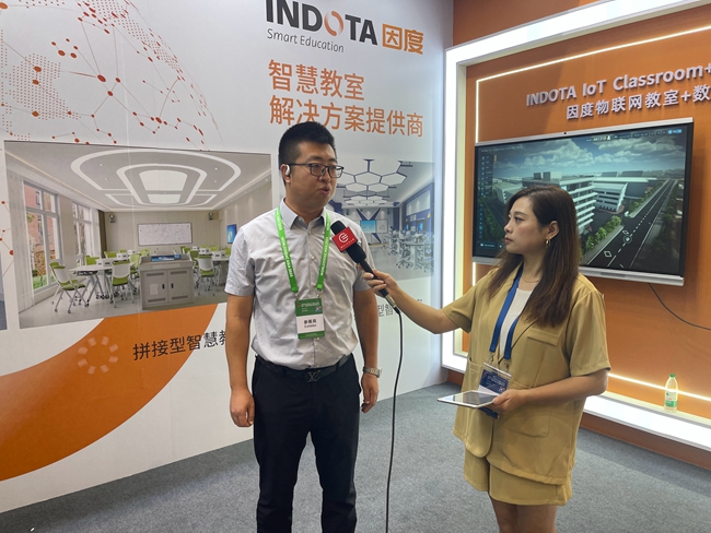 張總首先向觀眾致以問候。在問及本次展會帶來的新品與解決方案時,他表示,INDOT因度展示的是一整套智慧教室解決方案,其中包含兩大創新亮點:一是國內首推的“AI演講臺”,通過在演講臺中嵌入AI大模型,使教師能夠實時將講義內容同步傳輸至多種終端設備,并借助AI實現多語言翻譯與會議紀要自動生成,還可打包分發至不同會場的觀眾;二是持續研發的“物聯網+數字孿生”解決方案,致力于為學校管理者提供更可視化、科技化、綜合化的數據管理平臺。