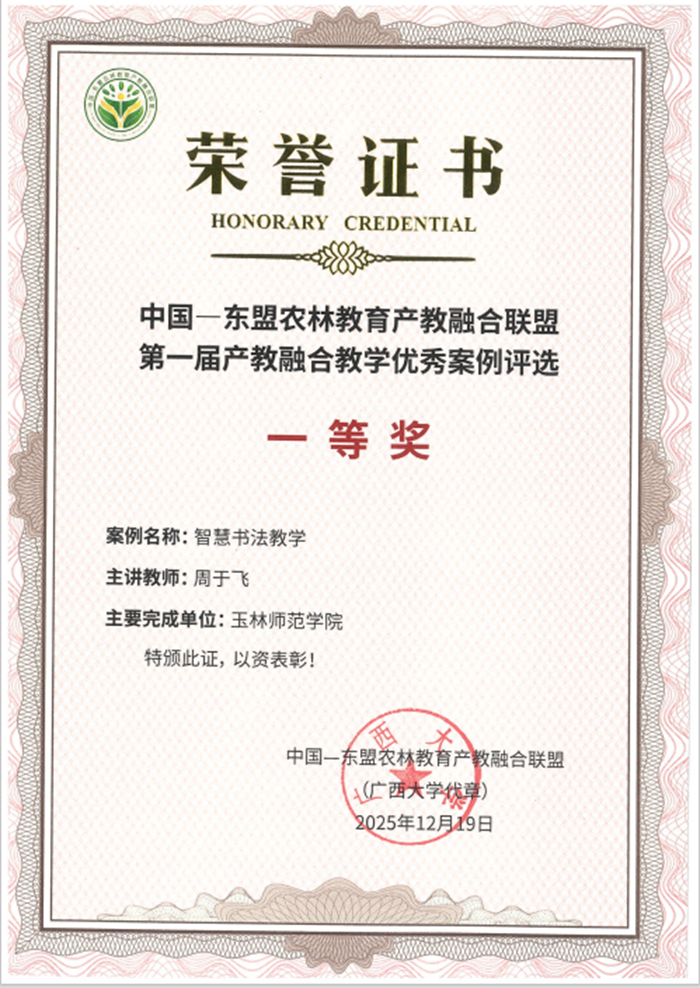 近日,在中國—東盟農林教育產教融合聯盟第一屆產教融合教學優秀案例評選中,玉林師范學院申報的“智慧書法教學”案例憑借創新的教學模式與顯著的實踐成效,一舉斬獲一等獎。