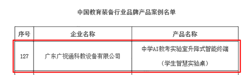 近日,中國教育裝備行業協會重磅公示了“中國教育裝備行業品牌企業案例名單”與“中國教育裝備行業品牌產品案例名單”。廣東廣視通科教設備有限公司憑借在理化生實驗室領域的深厚積淀與創新實力,成功入選品牌企業案例;旗下核心產品——中學AI教考實驗室升降式智能終端(學生智慧實驗桌)同步斬獲品牌產品案例殊榮,實現企業與產品雙維度權威認證。