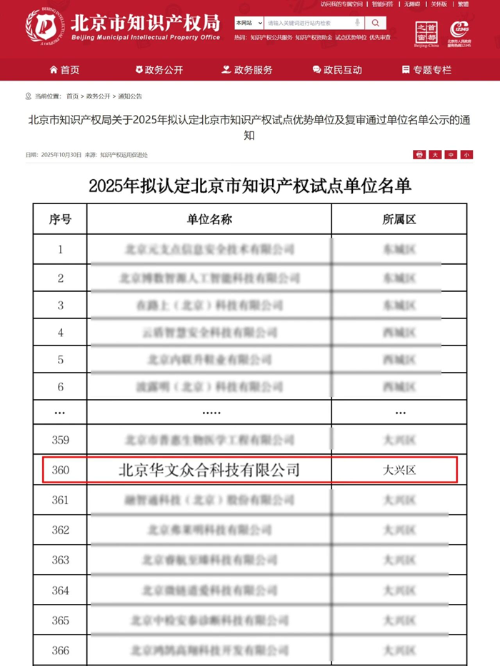 近日,北京市知識產(chǎn)權(quán)局公布2025年擬認定北京市知識產(chǎn)權(quán)試點優(yōu)勢單位及復(fù)審?fù)ㄟ^單位名單,北京華文眾合科技有限公司成功入選“2025年擬認定北京市知識產(chǎn)權(quán)試點單位”。