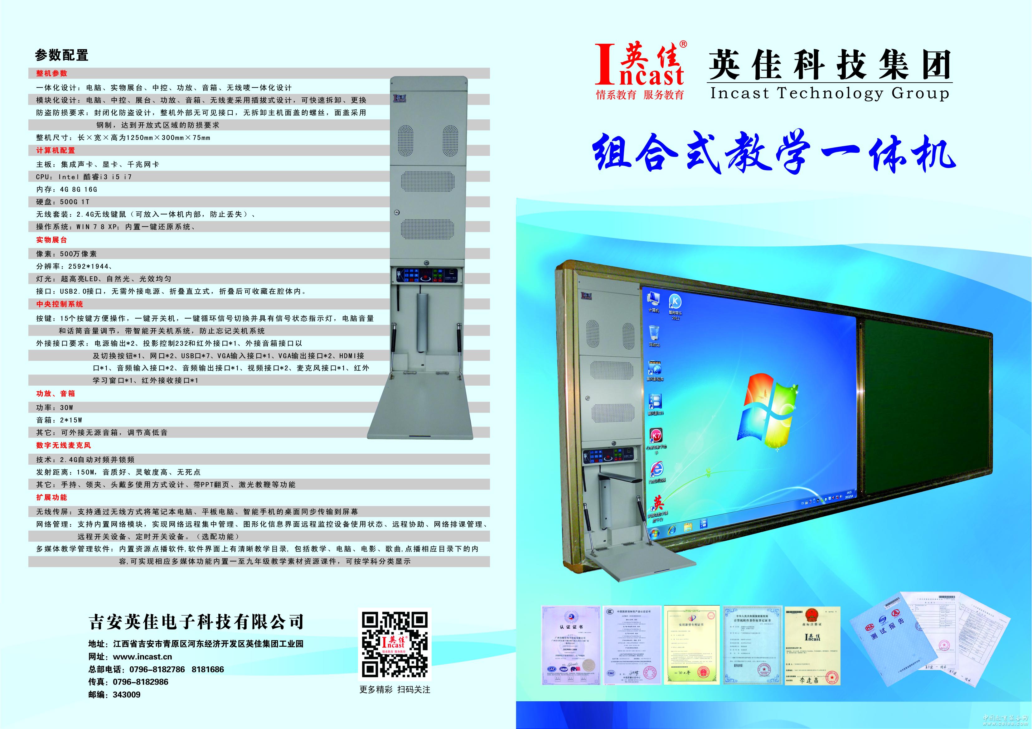 產品詳細介紹★1、壁掛式鋼結構設計,可嵌入到推拉黑板內,設備維護時無需拆除黑板,安全性高。內置計算機主機、高度集成2.4G多功能無線麥克風、高清錄播展臺、立體聲功放、高保真音箱,多媒體中央控制系統。 ★2、內置計算機參數配置:板載聲卡、顯卡、網卡,網卡速度1000M;CPU:intel四核2..0GHZ, 內存:4G, 硬盤:500G。USB接口;正版Windows操作系統,有支持VGA接口,具有RJ45網絡接口。 ★、整機配置:6路USB接口,白板USB獨立接口2路,采用USB放大器,增強型5V供電,使設備工作更加穩定,外接VGA:3*2路,支持外置筆記本VGA輸入,顯示器、投影機輸出。 4、外接視頻:1*1,DVD視頻輸入,1路視頻輸出投影機。 5、音頻接口:3*2路,內置PC輸入,外置筆記本輸入,DVD音頻輸入, 6、內置30W立體聲功放,可實現高音、低音調節,音箱根據要求內、外置。 7、紅外IR*2路;串口232*1路,可實現紅外和RX232控制投影機。 8、外置話筒接口輸入,可外接有線話筒,臺式話筒,無線麥克風。 9、2路RJ45網絡接口,1路可升級網絡中控控制,1路為NET網絡接口。 10、采用機械式按鍵控制面板,使用壽命可達1000萬次,可擴展紅外遙控控制。 ★11、中控采用“一鍵式”系統開關,操作方便,可升級網絡中控和IC卡排課系統。可擴展遙控控制一體機開關機及控制整機音量大小; ★12、帶智能開關機功能,可設定不使用一段時間后自動關閉系統,防止忘記關機(現場演示)。 ★13、采用最新2.4G無線傳輸技術,雙天線接收,靈敏度高,抗干擾能力強無線麥克風,3.7V、1200MA聚合物鋰電池,手持、領夾、頭戴多功能設計。支持PPT翻頁,激光電子教鞭功能,具有話筒音量調節,靜音,電量指示,液晶屏顯示工作狀態。 14、采用高穩定開關穩壓電源供電,外置投影機電源,幕布電源供電接口,延時控制可精確至秒(軟件設置),開機發碼和延時關機及斷電功能,保證外接設備安全。 ★15、具備電腦開關機檢測功能,防止中控與電腦控制在相反的開關機狀態(現場演示) 16、內置實物展示裝置(或可擴展實物展示裝置)通過USB與計算機連接,500萬像素,分辨率:2592*1944,高清圖像拍攝,并支持錄像功能。配置液壓升降桿,加強展臺托盤承重力。 ★17、內置可擴展防盜報警系統,具有延時斷電功能。 18、隨機配備適合小學、初中、高中云資源教學平臺;通過互聯網下載使用,兼容XP、Win7等微軟操作系統。內置資源管理軟件,可對教學課件進行有效管理,實現課件的存儲、播放,點播軟件界面設計目錄索引,可對教學資源庫,系統可操作軟件集中化管理,支持目前各種主流格式文件、圖片、音視頻等多媒體資源。 ★19、生產企業通過ISO9001國際質量管理體系認證,ISO40001環境認證,計ISO18001企業安全管理認證證書,計算機軟件著作權證書,多媒體一體機抗震防塵結構、內置智能中控模塊新型設計專利證書,防雷檢測報告,具備省級高新技術企業證書,省級企業技術進步投資促進會會員證書,生產廠家為2015數字校園綜合解決方案測試合格企業等。 |