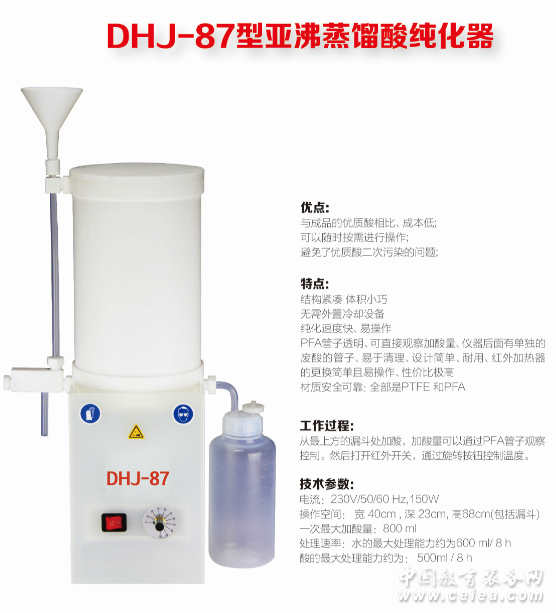 產品詳細介紹DHJ-87型PFA亞沸蒸餾酸純化器 優點: -與成品的優質酸相比,成本低 -可以隨時按需進行操作。 -避免了優質酸二次污染的問題 特點 : - 結構緊湊,體積小巧 - 無需外置冷卻設備