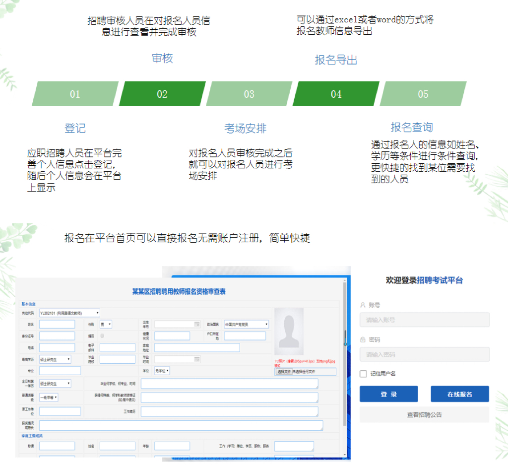 產品詳細介紹教師在線招聘系統提供一個快捷、方便的教師招聘報名渠道,平臺是集教師網上報名信息采集、考試管理、數據操作、安排下載準考證、應聘資格審核、成績查詢、招聘、考試通知、統計分析等為一體的網上報名系統。