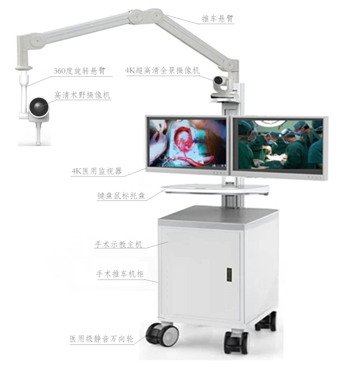 產品詳細介紹第一個模塊是術野攝像機,手術室術野攝像機;采集手術過程中的音視頻及處理。采用廣播級3G-SDI信號端口,硬解碼傳輸做到還原真實圖像,且不延時。品質保證,卓越性能,采用醫用電氣標準設計,電氣和材料特性穩定可靠。 支持快速啟動和低延時功能,啟動時間小于10s,視頻輸出延時小于 100ms,解決攝像機過爆問題:全自動控制和無影燈工作場景模式控制,用戶任意切換,以解決無影燈工作下,攝像機過曝的光斑現象。遠程控制:接口豐富,靈活接入,靈活選擇 UART 或 RS485 通信接口,支持 VISCA、Pelco P/D 等通信協。無影燈連接吊臂:萬向關節聯,全方位滿足手術中對術野攝像機各種高度、角度、體位的需求。