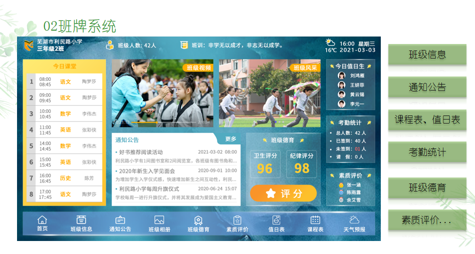 產品詳細介紹 加強班級文化建設和班級風采展示,為老師、家長、孩子所打造一個學習成長交流服務平臺。整合學校對外宣傳、日常互動交流、教師教學辦公等各種服務,讓每一個校園自然形成智慧化教育應用智慧校園平臺的數據呈現終端。通過電子班牌,呈現了班級文化的豐富多彩,同時也成為了學校和班級、教師和學生、家長和學生之間的互動媒介之一。