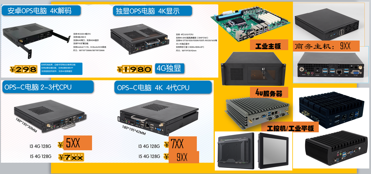 CPU集成顯卡HD Graphics VGA+HDMI單顯 ,雙顯(同/異步顯示) 1 × VGA (最大支持分辨率:1920×1080) 1 ×HDMI (最大支持分辨率:3840x2160) 網絡 芯片 WIFI 1 × RTL8211E 10/100/1000M(RJ45 LAN) 1 x AP6330正基 WIFI2.4G/5G雙模+BT I/O USB 2.0 Power button Reset OPS接口 LED燈 DC JACK 音頻 2× USB2.0(最多支持3組) 1 × power button 1 × 升級 1 × OPS接口(80pin) 1 x LED指標燈 1 × DC JACK 1 × LINE-OUT & MIC-IN ,集成6聲道音效ALC662聲卡芯片 電源 輸入 額定功耗 DC 12~19V 30W 物理參數 尺寸 180mm (L) x 119mm (W)x30mm(H) 環境;溫度 濕度;工作溫度:0°C ~50°C 儲存溫度:-20~70°C 5%~90% 無冷凝 愛鑫微電子作為國內OPS電腦產品線最全的研發、生產、銷售為一體的廠家,同時提供OEM/ODM定制服務,目前主產品線為: OPS電腦:Baytrail-J1800/J1900/Baytrail-CR Z8350/GeminiLake-N4000/N4100/J4105/J4005 CPU/HM76+2-3 代CPU/HM86+4代CPU/Skylake-u+6-7 代CPU/Whiskeylake-u+8-10代CPU/tigerlake-u+11代CPU(最新支持5K顯示或者8K分辨率顯示OPS電腦方案)。 OPS-C電腦:HM76+2-3代CPU/HM86+4代CPU/H77+2-3代CPU/H81+4代CPU/H110+6-7代CPU/ H310+8-9代CPU/H510+10-11代CPU。 獨顯OPS電腦:H81+4代CPU+獨顯GT730/960/1030/1050/1050TI/1650 2-4GB/ H110++6-7代CPU+獨顯GT730/960/1030/1050/1050TI/1650 2-4GB/ H310、H510+8-9-10-11代CPU +獨顯GT730/960/1030/1050/1050TI/1650、1060/1070 2-4-6GB顯卡。 國產化OPS電腦:國產CPU飛騰FT-2000/4 /兆芯KX-6000系列CPU+國產操作系統(UOS/Deepin/Kylin)系列OPS-C電腦 定制型OPS-C電腦:帶DVD光驅系列OPS-C電腦/超薄27MM系列OPS-C電腦/帶無線路由器系列OPS-C電腦/帶采集卡系列OPS-C電腦/帶雙網口三網 口/光端機OPS模塊/SDI OPS模塊/光纖SFP OPS電腦模塊/雙HDMI系列OPS電腦。 安卓OPS電腦:RK3328 安卓OPS電腦/RK3288 安卓OPS電腦/RK3399 安卓OPS電腦/RK3399PRO 安卓OPS電腦/RK3588 安卓OPS電腦系列/4K 30HZ/4K 60HZ/ 8K顯示OPS電腦。 SDM卡模塊:SDM-L:Skylake-u/H310系列/SDI系列 MINI PC/工控機:Geminilake/ Skylake-u/Cometlake-u系列 4U工控機/服務器:H110/H510-12盤位/24盤位 定制:LED會議一體機行業專用插拔式OPS電腦(超窄、超薄、超高性能) OPS轉接小板:支持3USB+HDMI/支持6USB+HDMI/支持5USB+HDMI+RJ 45網口/支持支持5USB+HDMI+VGA+RJ45網口/支持LVDS點屏/支持Vbyone 點屏。 另外愛鑫微同時也擁有能適配行業各大品牌的一體機的OPS電腦,如斯馬特(SMART)、普羅米休斯(promethean)、鴻合教育一體機(HiteVision鴻合)、newline會議一體機、康冠一體機、仙視觸控一體機、華為會議一體機、中興會議一體機、科達會議一體機、中銀會議一體機、惠科會議一體機、希沃一體機(SEWWO/MAXHUB)、聯騰一體機、聯想一體機、林電一體機、海信一體機、康佳一體機、TCL一體機、海爾一體機、創維一體機、長虹一體機、廈華一體機、東方中原一體機(IQBoard)、艾博德一體機(IBOARD)、印天一體機、皓麗電子白板一體機、互視達一體機、品祺一體機、海康一體機、大華一體機、宇視一體機、中科一體機、中興一體機、AOC會議一體機、飛利浦會議一體機(PHILIPS)商用顯示器、NEC商用顯示器、NEC會議一體機、松下一體機(Panasonic)商用顯示器、三星電子白板一體機(SAMSUNG)商用顯示器、LG會議一體機商用顯示器、京東方會議電子白板一體機(BOE)商用顯示器、雷曼LED會議一體機、科倫特LED會議一體機、利亞德LED會議一體機、洲明LED會議一體機、聯建LED會議一體機、艾比森LED會議一體機、奧拓LED會議一體機、希達LED會議一體機、上海大因LED會議一體機、上海三思LED會議一體機、白板一體機、錄播一體機、壁掛式教學一體機、云平臺一體機、幼教一體機、會議一體機、LED會議一體機、觸控一體機 教育一體機 教學觸摸一體機 液晶電子白板,電子白板,壁掛式教學一體機,電子白板一體機,商務會議一體機,數字標牌,廣告機,觸摸一體機,觸摸茶幾,多媒體互動教學一體機,交互式電子白板一體機,電視電腦一體機,酒店客房一體機商用顯示器,會議機,一體機,無紙化辦公,電子白板、4K(3840x2160) 60HZ、5K(5120x2880)與8K(7680x4320) OPS電腦模塊、102寸會議一體機OPS電腦、4屏顯示OPS電腦一體機、4屏拼接OPS電腦一體機、GTX1060 6G獨顯OPS電腦一體機、4K顯示OPS電腦、5K顯示OPS主機、8K顯示OPS工業電腦、SDM卡模塊、SDM模塊主機 OPS子卡,OPS電腦轉接板,OPS接口板,OPS對接板,OPS電腦,OPS內置電腦,OPS電腦盒,工業級OPS電腦,OPS-C電腦,OPS-C內置電腦,OPS-C電腦盒,工業級OPS-C電腦,OPS-C+電腦,OPS-C+內置電腦,OPS-C+電腦盒,工業級OPS-C+電腦,獨顯OPS電腦,2G獨顯OPS電腦,4G獨顯OPS電腦,6G獨顯OPS電腦,OPS獨顯電腦,8K極清OPS電腦,skylake系列OPS電腦,H710系列OPS主機、H510系列OPS電腦,H310系列OPS電腦,H110系列OPS電腦,H81系列OPS電腦,H61系列OPS電腦,APOLLO系列OPS電腦,skylake-u系列OPS電腦,whiskeylake-u系列OPS電腦、tigerlake-u系列OPS電腦、Z8350系列OPS電腦,Z8550系列OPS電腦,J1900系列OPS電腦,J1800系列OPS電腦,baytrail系列OPS電腦J4105系列OPS電腦,N4000系列OPS電腦,J3355系列OPS電腦,J3455系列OPS電腦,6100U系列OPS電腦,6500系列OPS電腦,6700系列OPS電腦,I3 8100系列OPS電腦,I5 9400 OPS電腦,I3/I5/I7 OPS電腦,安卓OPS電腦,光纖OPS電腦,RK3328 安卓OPS電腦,RK3288安卓OPS電腦,RK3399安卓OPS電腦,RK3399pro 安卓OPS電腦,RK3588 安卓OPS電腦,4K 60HZ OPS電腦,8K OPS電腦,筆記本OPS電腦,臺式機OPS電腦,標準OPS電腦,OPS-C電腦,OPS-C+電腦,OPS電腦高清圖片,OPS電腦品牌,OPS電腦供應商,OPS電腦報價,OPS電腦廠家,OPS電腦定義,OPS電腦結構,觸控一體機內置OPS電腦,教學一體機內置OPS電腦,交互式大屏OPS電腦,交互式電子白板OPS電腦,