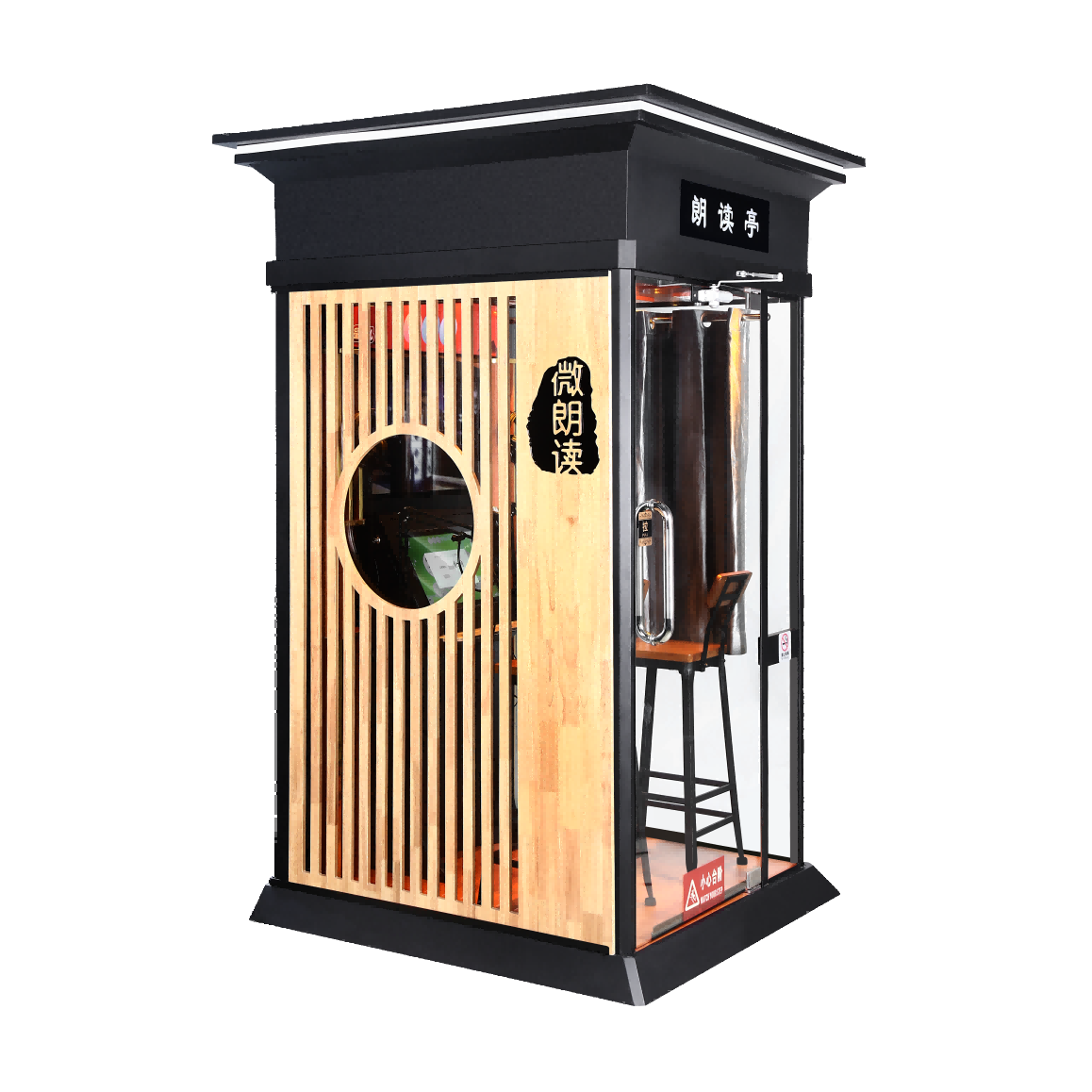 4、整體框架組成:(1)框架:使用500兆帕強度四級鋼材制作而成鋼框架,三面采用10mm鋼化玻璃,兩面配有裝飾柵格木板,吊頂采用12mm復合防火板;(2)文化展示燈箱:內部文化展示燈箱,尺寸73*17cm;外部頂部文化展示燈箱,尺寸98*18cm;(3)殺菌系統(tǒng):全倉配有紫外線殺菌系統(tǒng);(4)照明系統(tǒng):1Wx12盞LED燈嵌入式照明氛圍燈;(5)門禁系統(tǒng):支持密碼開門、身份證,校園卡刷卡進門IC/ID;(6)監(jiān)控系統(tǒng):安全監(jiān)控攝像頭360度監(jiān)視,1080P循環(huán)錄制功能,16GB存儲,支持移動遠程查看、網絡存儲;