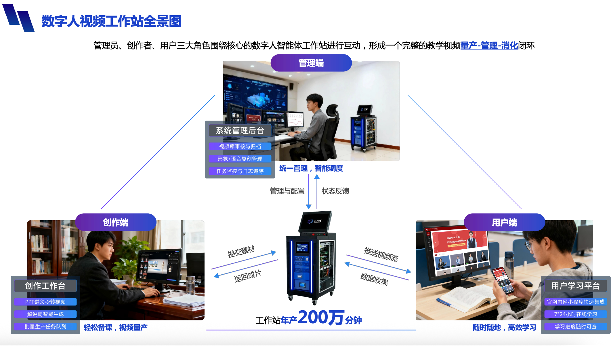產(chǎn)品詳細(xì)介紹“億話-數(shù)字人智能體工作站全棧解決方案”是八點八數(shù)字科技面向高校推出的教育數(shù)字化一體化平臺,深度融合大模型、數(shù)字人技術(shù)與智能體應(yīng)用,致力于為教師減負(fù)、為教學(xué)增效、為校園賦能。該方案支持**一鍵批量生成高質(zhì)量微課視頻**,將傳統(tǒng)數(shù)日的課件制作流程壓縮至數(shù)小時,助力教師高效構(gòu)建校本資源庫;同時提供**真人級形象與聲音復(fù)刻**,打造親切可信的“數(shù)字教師”,實現(xiàn)7×24小時智能交互與精準(zhǔn)答疑。系統(tǒng)覆蓋教學(xué)、管理、宣傳、服務(wù)四大核心場景,可靈活嵌入學(xué)校官網(wǎng)、小程序、校園APP等多終端,并支持全棧本地化部署,確保數(shù)據(jù)安全與合規(guī)。目前已在華南理工大學(xué)、電子科技大學(xué)、華東師范大學(xué)等多所高校成功落地,正成為推動高校教育數(shù)字化轉(zhuǎn)型、構(gòu)建智慧校園新生態(tài)的關(guān)鍵基礎(chǔ)設(shè)施。
