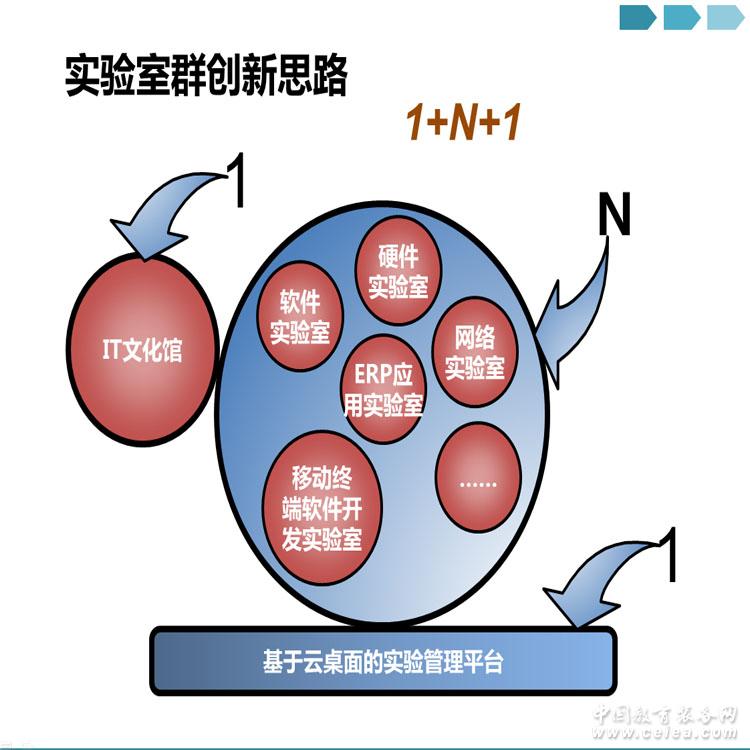 “1+N+1”是在一個云平臺管理系統的基礎上,建立N個實驗室,其中包括計算機軟件研發類,計算機硬件測試調試類,計算機網絡類,計算機應用類等各方面的實驗室,以滿足各類院校的需求。IT文化館則是針對各類實驗室建立的計算機文化觀摩教學中心,是實驗教學的創新發展。“1+N+1”方案有以下特點: