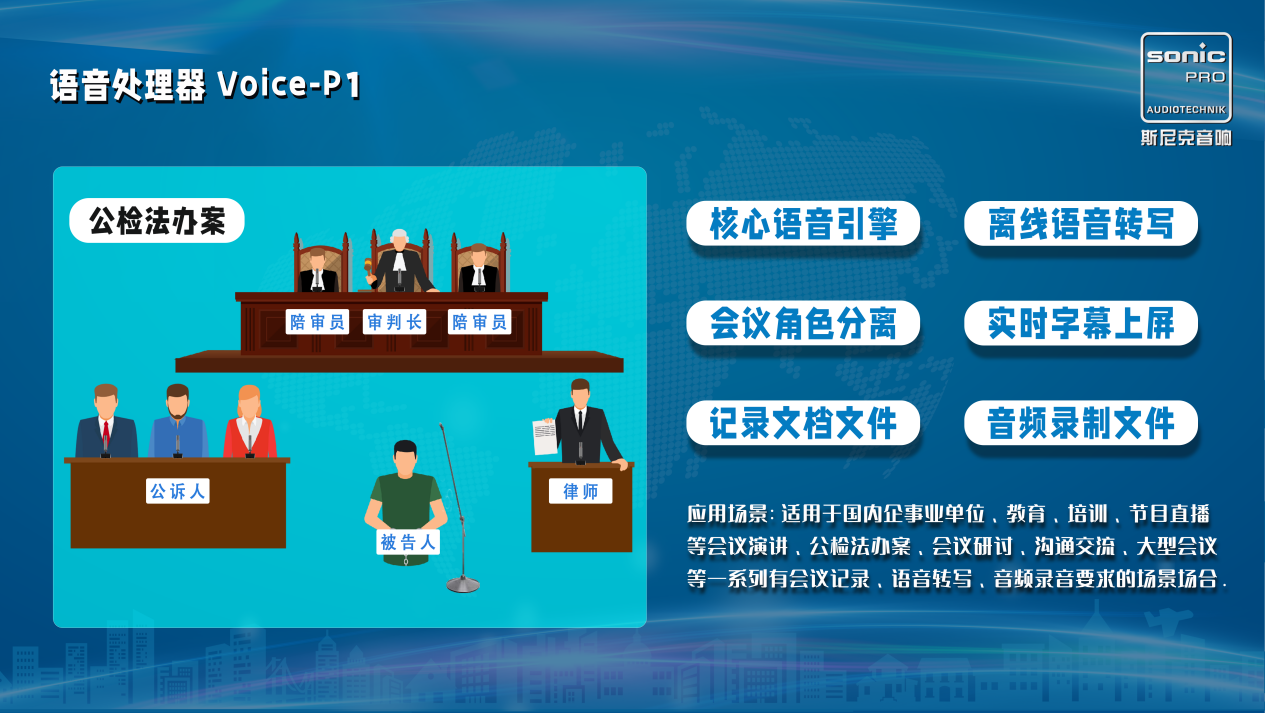 SONIC PRO斯尼克音響植入業(yè)內(nèi)龍頭核心語音引擎,結(jié)合我們多年多會議場合應(yīng)用經(jīng)驗專門開發(fā)一款軟硬件結(jié)合,實現(xiàn)實時語音轉(zhuǎn)寫、會議記錄、音頻錄音的綜合語音處理器,該款語音處理器采用離線私有化部署運用核心語音識別轉(zhuǎn)寫技術(shù)語音清晰標準中文普通話轉(zhuǎn)寫準確率高達97%,同時支持英文轉(zhuǎn)寫,英文轉(zhuǎn)寫準確率達93%,在斯尼克語音處理器的應(yīng)用下的會議場合,能幫助用戶解決會議過程中現(xiàn)場擴聲語音以及播放的音頻文件實時轉(zhuǎn)寫成文字,并能形成跑馬字幕上屏,輔助會議記錄人員進行會議紀要的整理與校正,系統(tǒng)提供的語氣詞過濾、自動分段等功能自動優(yōu)化文字結(jié)果實現(xiàn)快速成稿。特別適用于國內(nèi)企事業(yè)單位、公檢法辦案、教育、培訓(xùn)、節(jié)目直播等會議演講、會議研討、溝通交流、大型會議等一系列有會議記錄、語音轉(zhuǎn)寫、音頻錄音要求的場景場合。