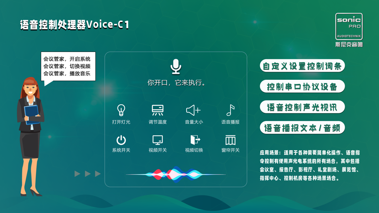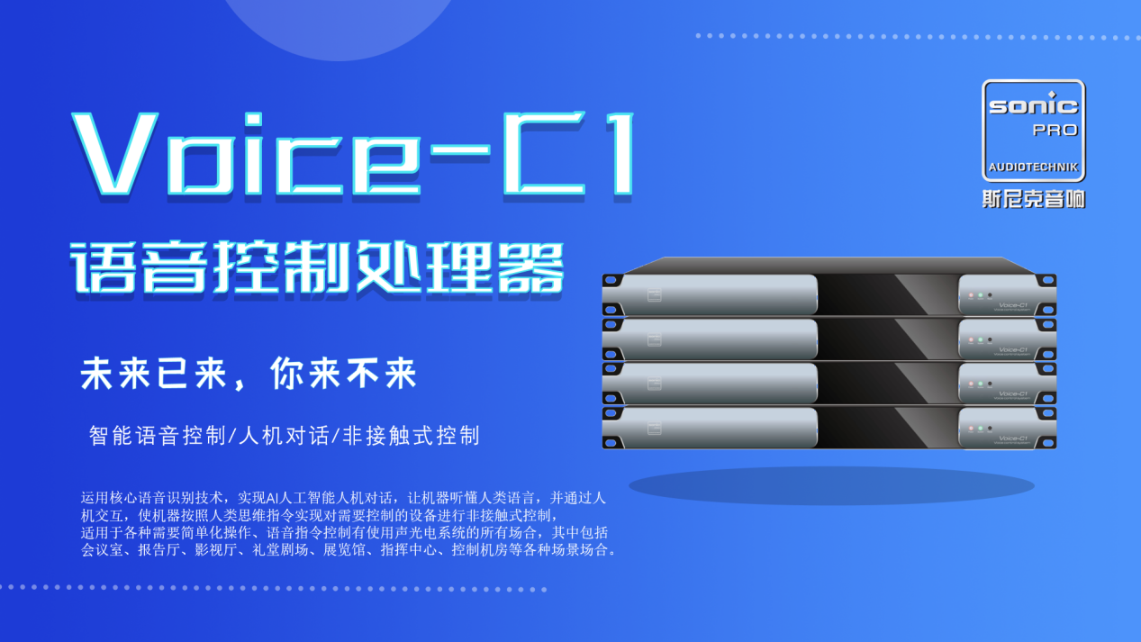 SONIC PRO斯尼克音響植入業(yè)內(nèi)龍頭核心語音引擎,結(jié)合我們多年多會議場合應(yīng)用經(jīng)驗專門開發(fā)一款軟硬件結(jié)合,實時離線版語音控制處理器,該款語音控制處理器采用離線私有化部署運用核心語音識別技術(shù),實現(xiàn)AI人工智能人機對話,讓機器聽懂人類語言,并通過人機交互,使機器按照人類思維指令實現(xiàn)對需要控制的設(shè)備進性非接觸式控制,在斯尼克語音控制處理器的應(yīng)用下,能幫助用戶解決復(fù)雜音響系統(tǒng)實際控制與操作。語音控制處理器與SONIC PRO斯尼克音響中所有支持控制的數(shù)字化設(shè)備,適用于各種需要簡單化操作、語音指令控制有使用聲光電系統(tǒng)的所有場合,其中包括會議室、報告廳、影視廳、禮堂劇場、展覽館、指揮中心、控制機房等各種場景場合。