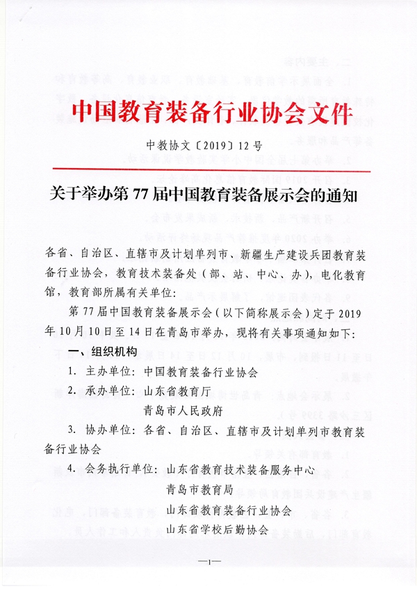 第77屆中國教育裝備展示會(以下簡稱展示會)定于2019年10月10日至14日在青島市舉辦,現將有關事項通知如下: