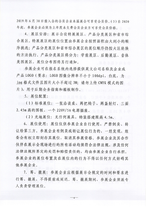 4.展區安排:展示會設特展展區、產品分類展區和省市綜合展區。特展展區的展位位置由參展企業按照面積由大到小的順序挑選;產品分類展區和省市綜合展區的展位順序仍按大區輪換的方法執行。產品分類展區將分為:學前展區、后勤展區、音體美圖展區。展位分布圖將另行通知。