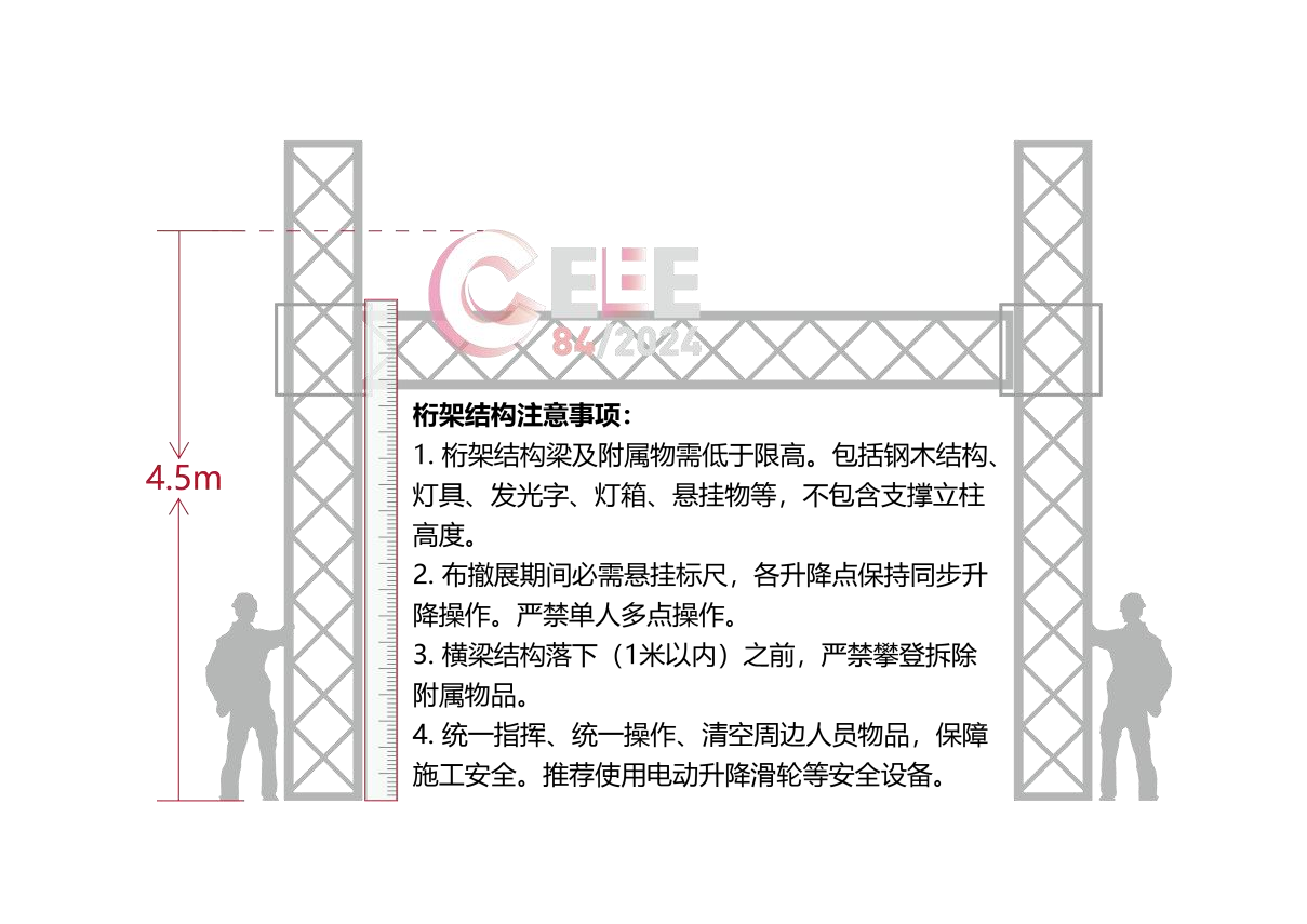 3.展臺搭建限高:4.5米;全館禁止搭建雙層結構或超高展臺,無懸掛物背板厚度不得少于20CM,龍骨間距不得大于40CM;桁架結構展臺高度以及施工標準請參考下圖。